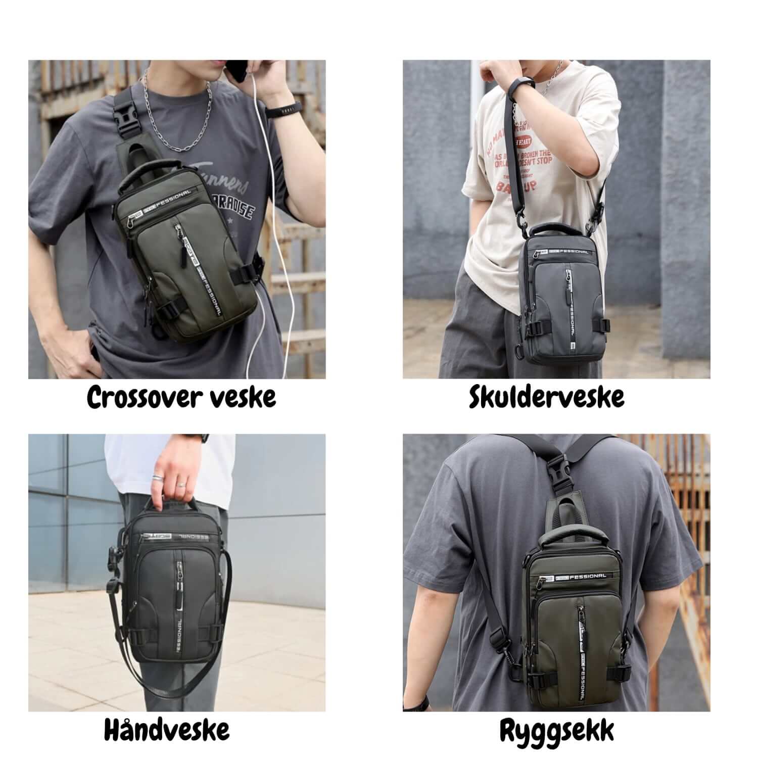 Multifunksjonell veske. Med 5 reimfester på baksiden, har denne vesken en rekke bruksområder. Denne kan fint benyttes som veske, ryggsekk, skulderveske, diagonal veske, mini bag. Som diagonal veske, kan du til og med velge å ha reimen fra venstre til høyre, eller motsatt. Takket være det ergonomiske designet, er den velig behagelig og lett, og gir god komfort.