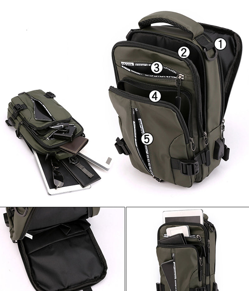 Totalt 5 store lommer. 4 hovedlommer samt 1 diskre frontlomme med glidelås. I hovedlommene vil du også finne eget mobillomme, dokument lomme, samt PC/Ipad lomme. Med all denne kapasiteten vil du enkelt kunne organisere og oppbevare dine eiendeler, spesielt når mann har for mange dingser mann ønsker å ta med seg på reiser, aktiviteter osv.